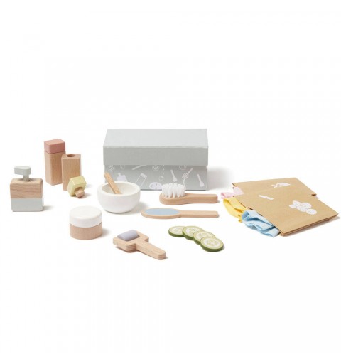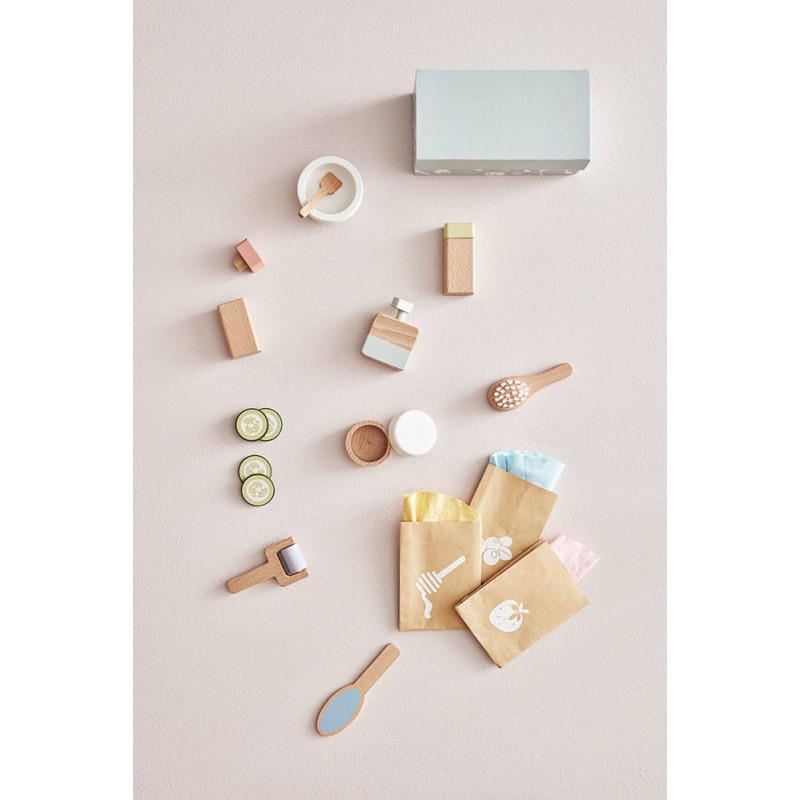 - Materiał: Butelka z pokrywką, butelka z pompką, słoiczek, miska, pilnik do stóp, łyżka: buk. Wałek do masażu twarzy: buk, schima. Ogórek: sklejka lipowa. Szczotka: buk, nylon. Maska na twarz: poliester z mikrowłókien. Pudełko, torebki: papier.