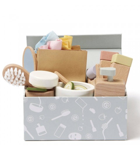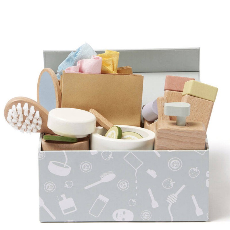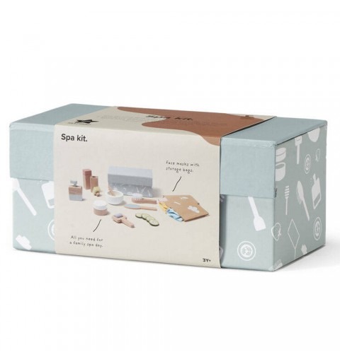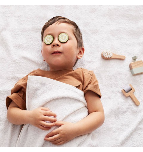 Maseczki, masaż i relaks! Cała rodzina może mieć teraz domowe spa. Tak, czasami zarówno dorośli, jak i dzieci mogą się trochę zrelaksować. Ten luksusowy zestaw spa dla dzieci zawiera wszystko, czego potrzebujesz, by się rozluźnić i uspokoić na chwilę. Drewniana butelka z pompką ma wbudowaną małą sprężynkę, dzięki temu przypomina prawdziwą butelkę z kosmetykiem. Zestaw zawiera również miskę do mieszania i małą łyżeczkę, niezbędne do przygotowania peelingu lub maski do ciała. I co to byłoby za spa bez plasterków ogórka i uroczej maseczki? Maseczki na twarz są wykonane z tego samego materiału co klasyczna maseczka na tkaninie. Masz do wyboru trzy różne rodzaje maseczki – na bazie jagód, miodu i truskawek. Kiedy zabawa dobiegnie końca, bez trudu umieścisz wszystkie akcesoria w naszym pudełku spa z magnetycznym zamknięciem.
