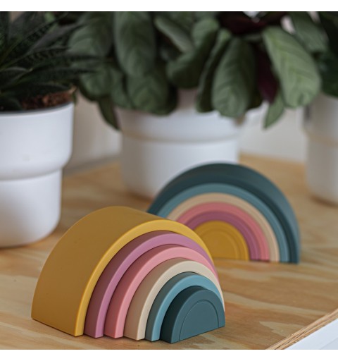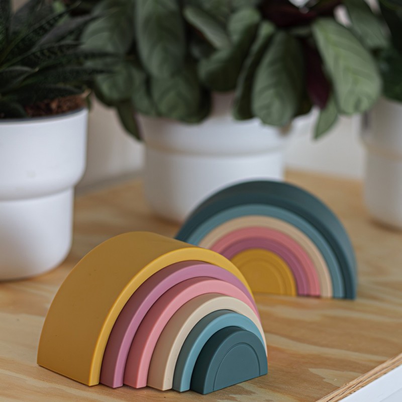 Silikonowa zabawka – układanka RAINBOW składa się z sześciu kolorowych łuków, które nałożone jeden na drugi tworzą przepiękną tęczę. Tęcza jest magicznym portalem do świata kształtów, kolorów i edukacji. Układanie łuków, obracanie nimi, czy też układanie jednego łuku na drugim to doskonały trening dla małych rączek. Dziecko ćwiczy precyzję ruchów i koordynację. Układanka wzbudza zainteresowanie u dziecka, w przyjemny i angażujący sposób skupia jego uwagę i uczy myślenia kreatywnego. Układanie nie narzuca określonych reguł, sprzyjając kreatywności. Zapewniając sobie doskonałą zabawę, dziecko może tworzyć własne konstrukcje i rozwijać zdolności projektowania oraz ćwiczyć wyobraźnię przestrzenną.