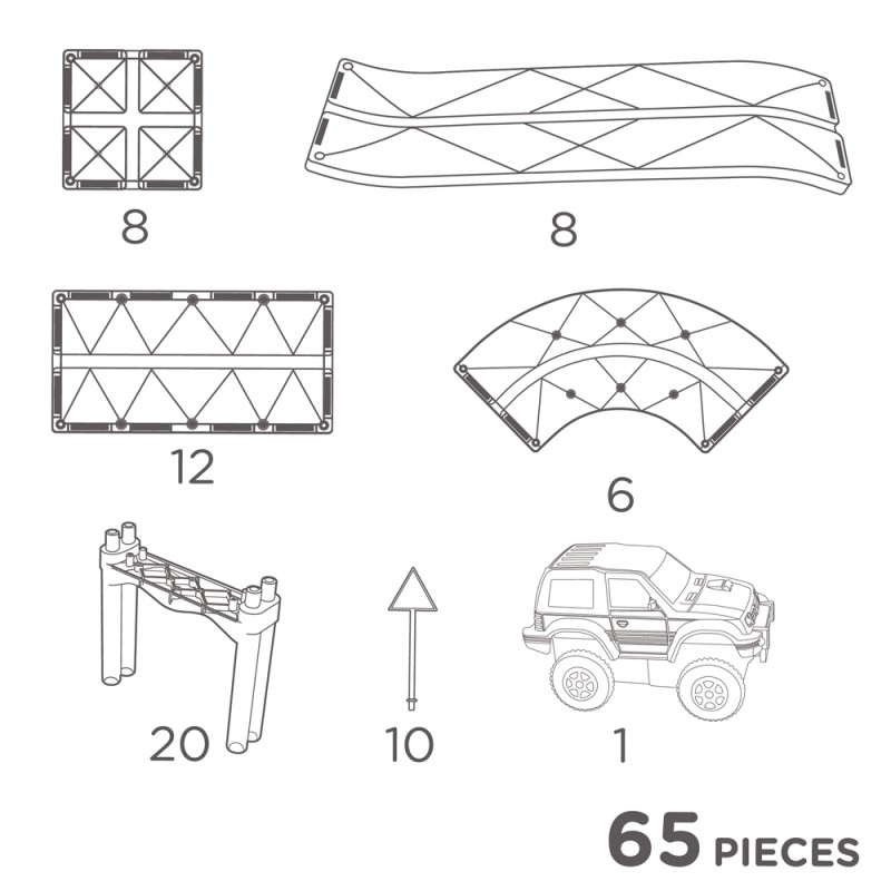 Z tym 65-elementowym zestawem Cleverclixx radość, jaką sprawia zabawa w wyścigi, nigdy się nie kończy. Twoje dziecko będzie budować najfajniejsze tory wyścigowe w żywych, wesołych kolorach. Aby zabawa była jeszcze lepsza do zestawu dołączyliśmy znaki drogowe, samochód i filary.