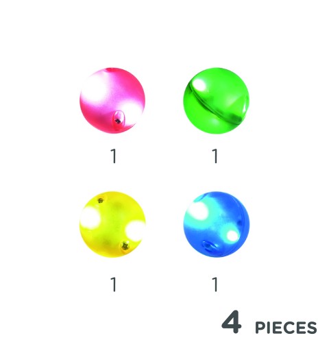 Dzięki świecącym kulkom z tego zestawu zabawa kulodromem będzie jeszcze bardziej fascynująca. Przyciemnij trochę oświetlenie w pokoju i obserwuj ścigające się kulki! Te wspaniałe kulki świecą w ciemności. Im szybciej się toczą, tym jaśniejsze jest światło! Jednak gdy kulka się nie porusza, przestaje świecić. Święcące kulki sprzedawane są w zestawach zawierających 4 kulki w różnych kolorach.