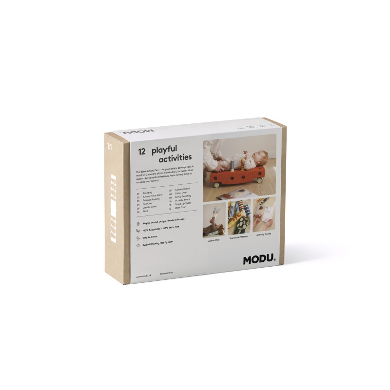 Wspieraj rozwój swojego dziecka w pierwszym roku jego życia! Nowy element zestawów MODU - Baby activity set - to wyjątkowa zabawka, która pobudza maluszka do aktywnej zabawy i odkrywania świata. Maluch ćwicząc razem z rodzicem - uczy się bliskości, miłości i świetnie się bawi ze swoimi bliskimi.MODU - Baby activity set został opracowany we współpracy z terapeutką zajęciową, Anną Sundby Jensen. Do zestawu dołączony jest Przewodnik Aktywności zawierający 12 ćwiczeń na pierwsze 12 miesięcy życia dziecka. Przewodnik zawiera zdjęcia i instrukcje przedstawiające najważniejsze etapy rozwoju motorycznego, począwszy od karmienia, leżenia na brzuszku po raczkowanie i później pierwsze kroki. Przewodnik w języku polski do pobrania tutaj.