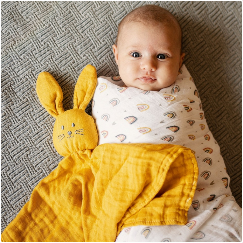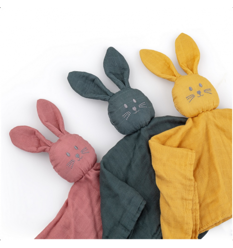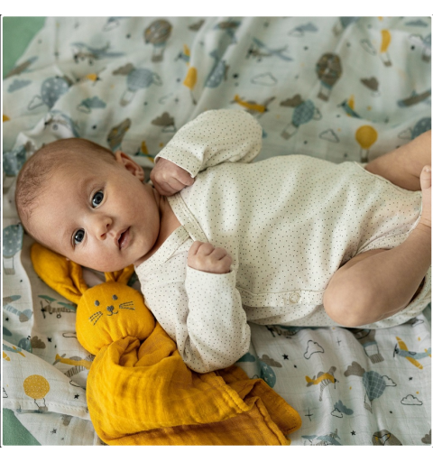 Oprócz uroczego króliczka Hugo, w kolekcji z bambusowego muślinu dostępne są również pieluszki bambusowe Moussy oraz otulacze Misty.