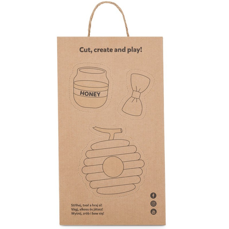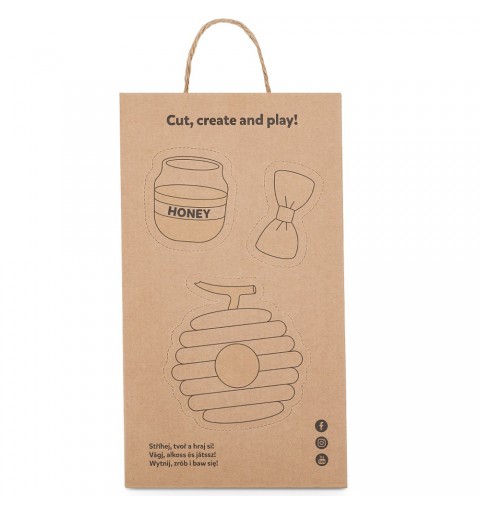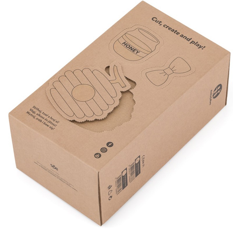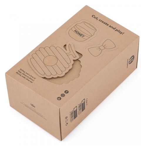 Nasze misie zostały zapakowane w piękne ekologiczne pudełka, które mają zabawne zastosowania. Z tyłu każdego pudełeczka nadrukowane zostały akcesoria do zabawy, które można łatwo wyciąć dzięki perforacji. Pudełko może też służyć jako domek dla misia.