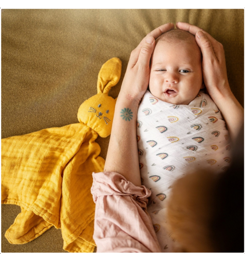 Oprócz uroczego króliczka Hugo, w kolekcji z bambusowego muślinu dostępne są również pieluszki bambusowe Moussy oraz otulacze Misty.