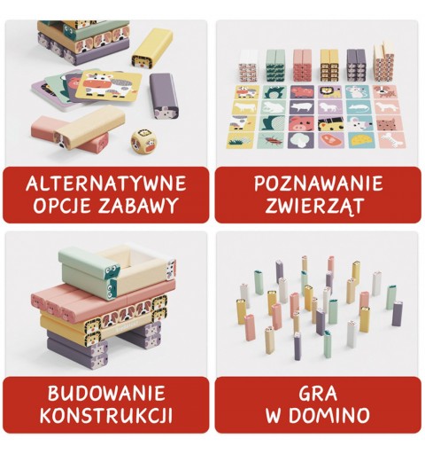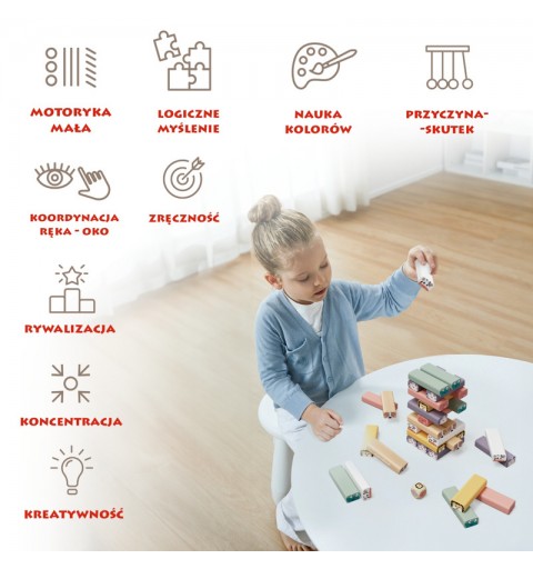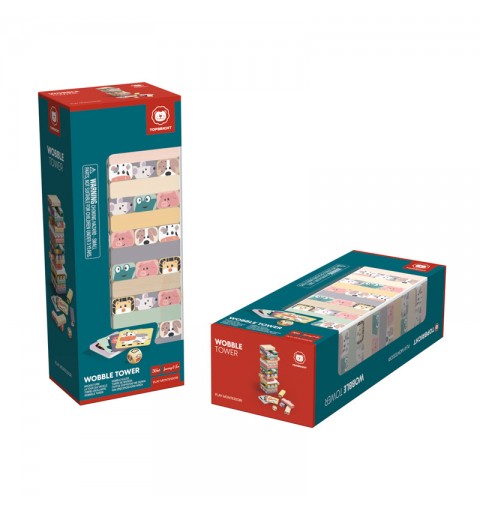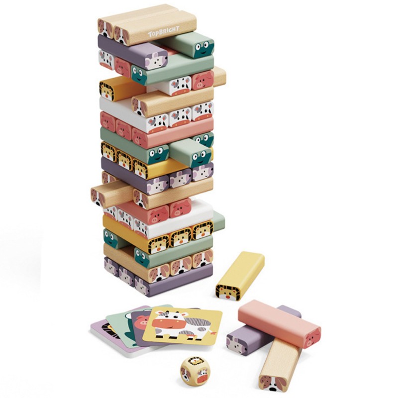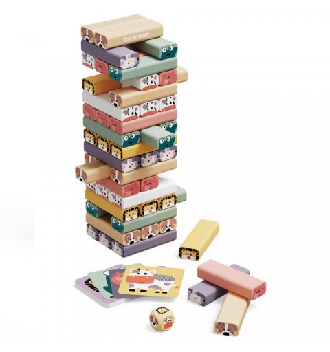 Wieża ze zwierzętami od Topbright to gra zręcznościowa gwarantująca niekończącą się zabawę. Niezależnie od tego, czy dziecko buduje wieżę, gra w kolorowe domino, czy wyjmuje klocki, pilnując by wieża nie upadła. Aby ustawić wieżę, dzieci umieszczają drewniane klocki z nadrukami zwierząt jeden na drugim. A potem zaczyna się zabawa! Na zmianę rzucają kostką lub losują karty jedna po drugiej i odpowiadają na pytanie „Jakie to zwierzę?”. Następnie ostrożnie wyciągają z wieży pasujący drewniany klocek ze wskazanym zwierzęciem i umieszczają go na górze. Ale uwaga! Jeśli wieża się zawali, gra się kończy i trzeba zacząć od nowa. Strategiczna gra jest także formą rywalizacji. Uczy dziecko akceptowania rzeczywistości.