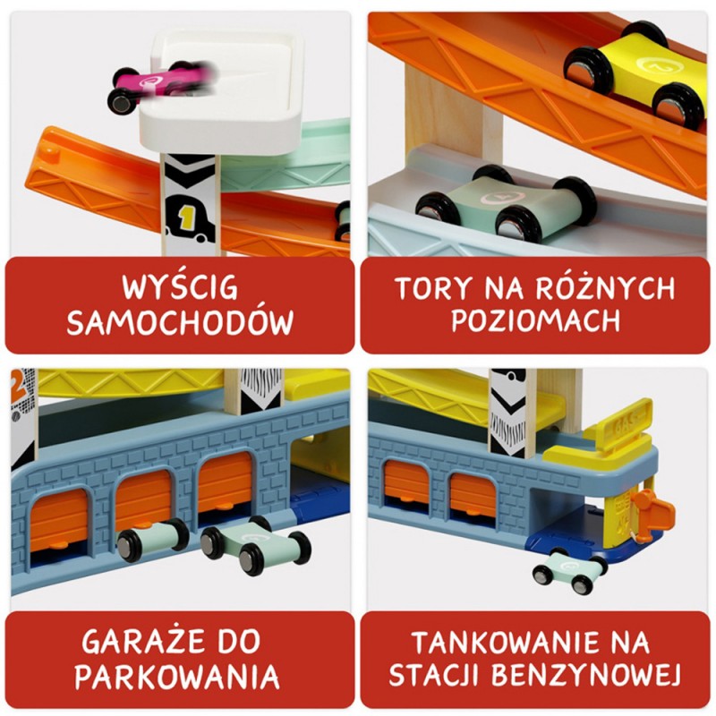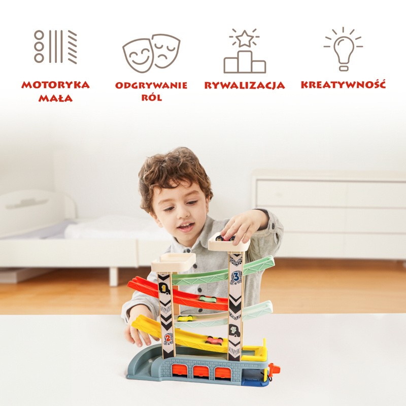 Tor wyścigowy, który został tak zaprojektowany, by jazda po nim była superszybka i ekscytująca. To komplet z autami, garażami, parkingami, warsztatem i stacją benzynową, który gwarantuje dzieciom wiele godzin tematycznej zabawy. Podczas przesuwania pojazdów maluchy ćwiczą koordynację oko-ręka oraz motorykę małą.