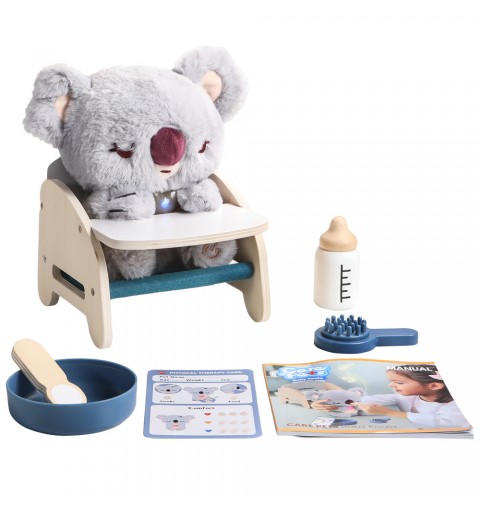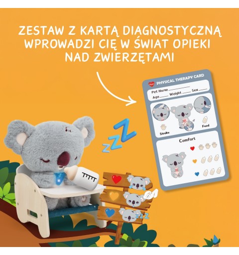Interaktywny koala, krzesełko, butelka, miska na jedzenie, szczotka, łyżka, karta diagnostyczna.