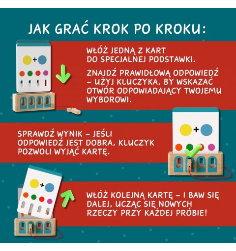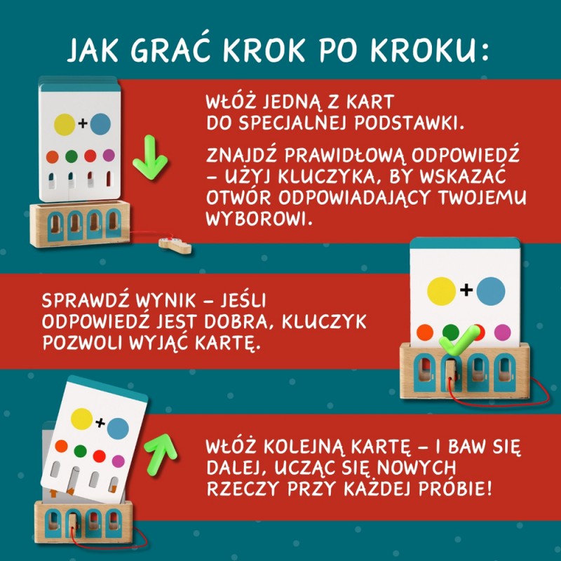 Zestaw zawiera: 1 kluczyk, 1 podstawka, 40 kart dwustronnych (80 zadań)